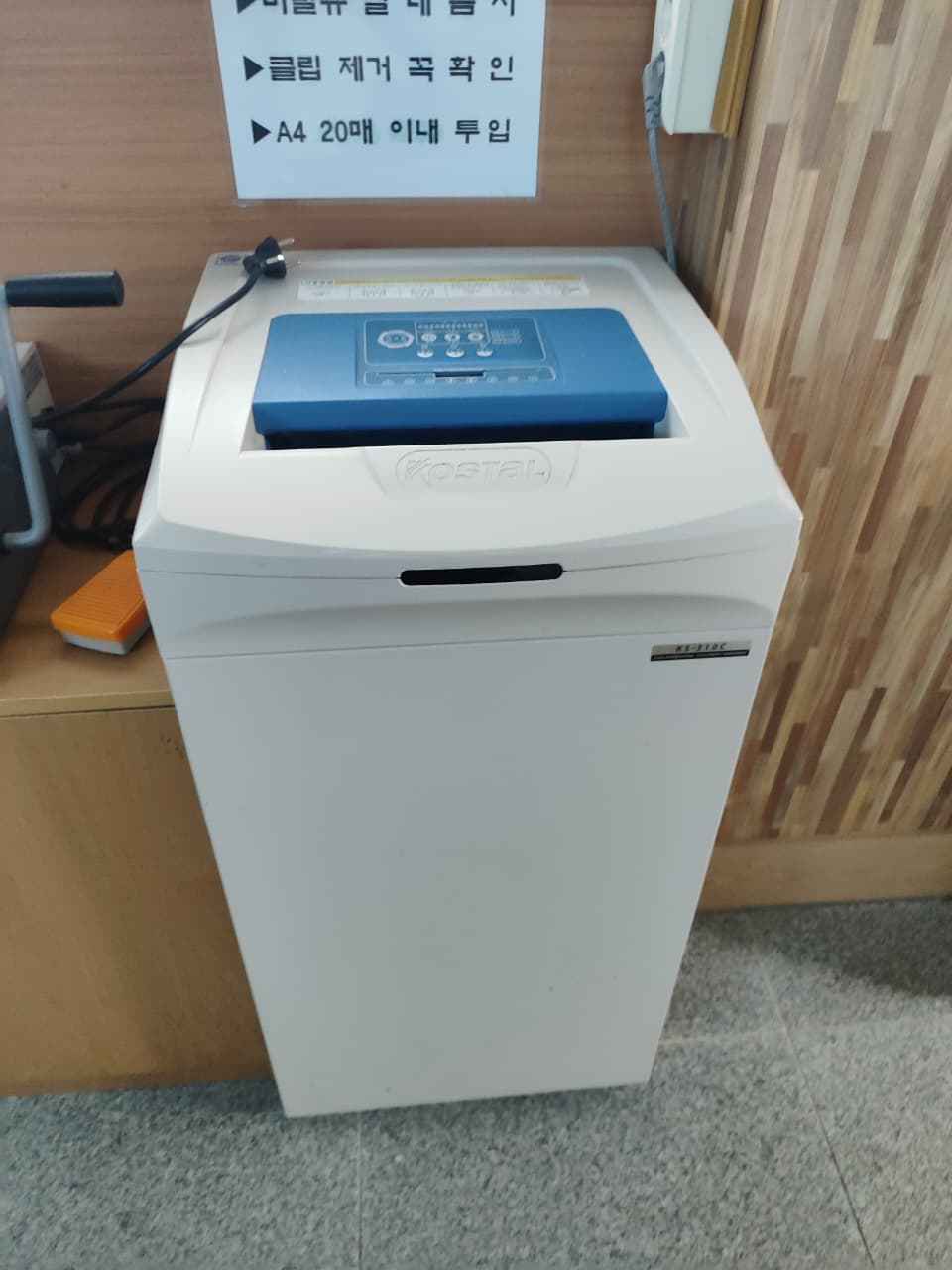 Tempat sampah di sini juga sudah dilengkapi dengan kantong plastik, jadi kalau sudah penuh tinggal diangkat dan diganti. Selain itu, di dekat ruang administrasi juga ada mesin penghancur kertas (paper shredder) yang digunakan untuk menghancurkan dokumen penting. Cukup tekan tombol, dan kertas akan langsung tercacah rapi.
